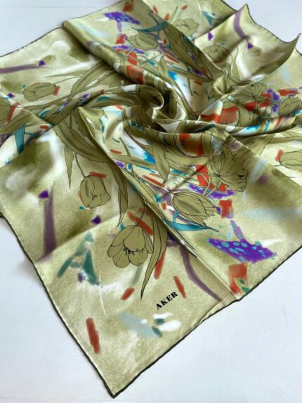 Tüm Eşarp ve Şal Modelleri – Defolu İpek Eşarp Aker Tivil Saf İpek Eşarp 49612 Yeşil Karışık Desen Renk: Yeşil,turuncu,mor,mavi Kumaş