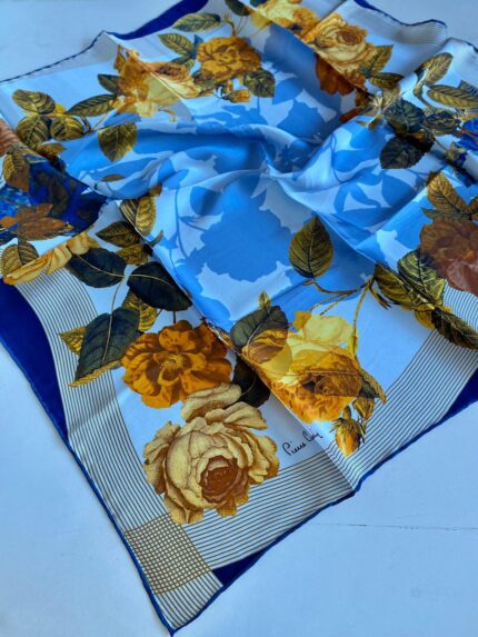 Lacivert, mavi, krem, yeşil, sarı, turuncu renkleri ile karışık desen oluşturulmuştur.