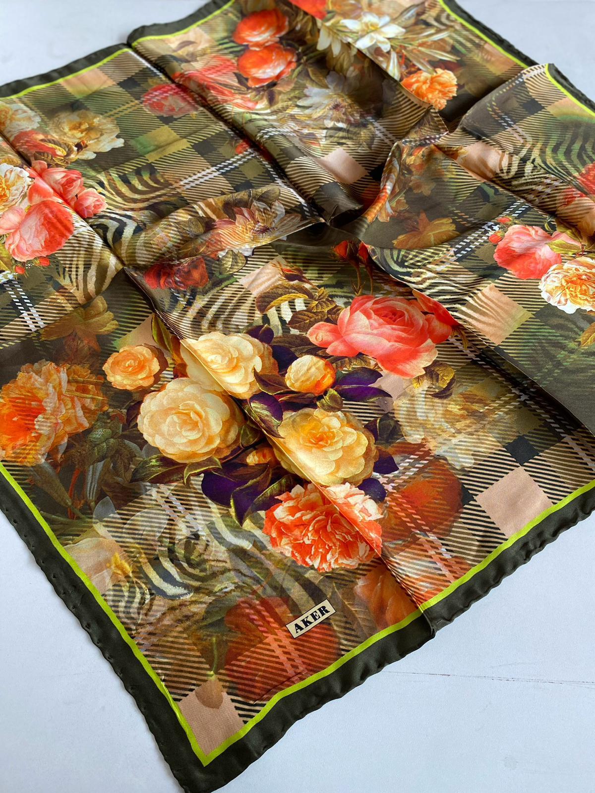 Aker Haki Çiçek Desenli Tivil İpek Eşarp 27942