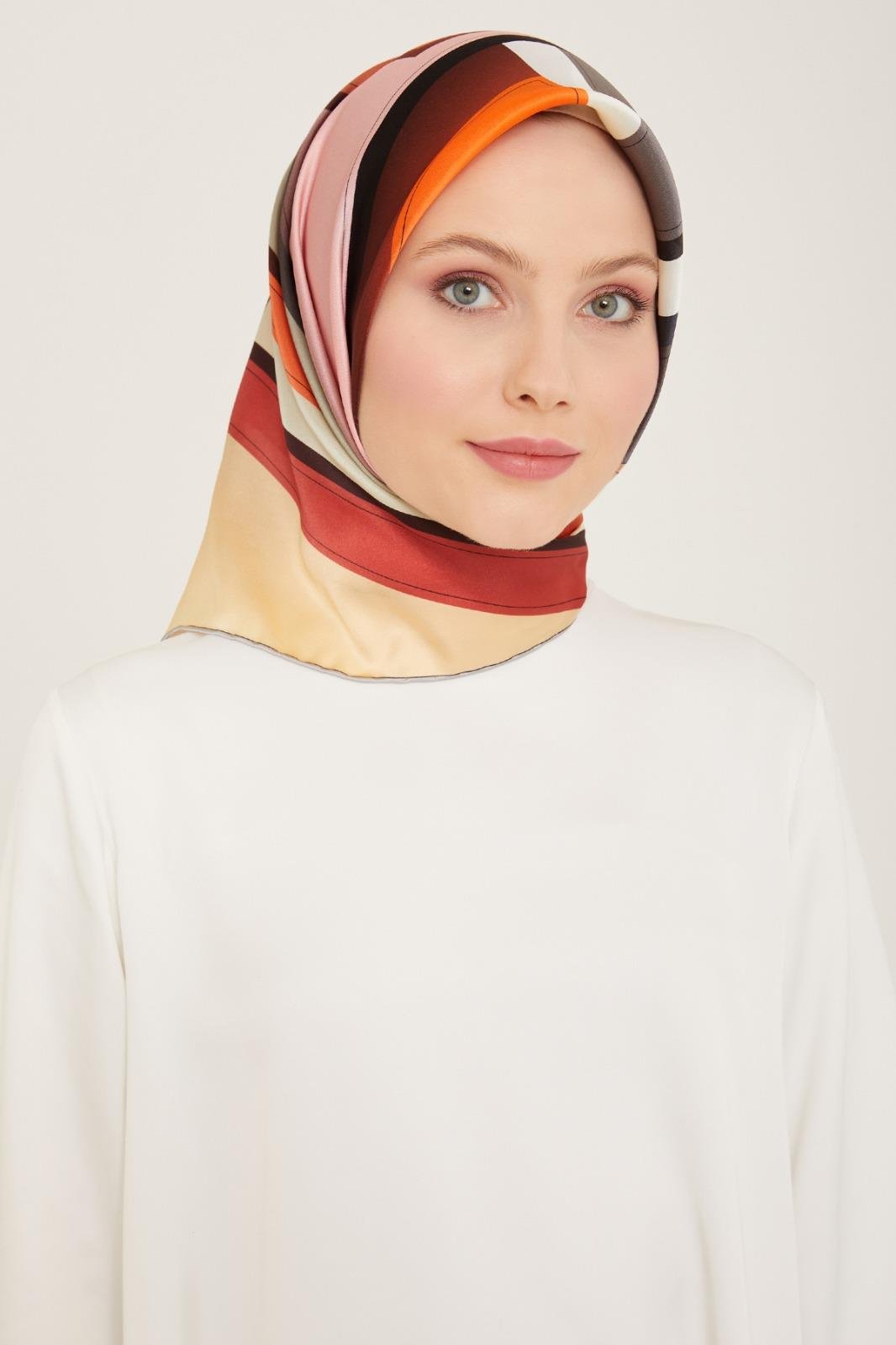 Armine Gül Kurusu – Kahverengi Geometrik Desen Tivil İpek Eşarp 9122 – 39