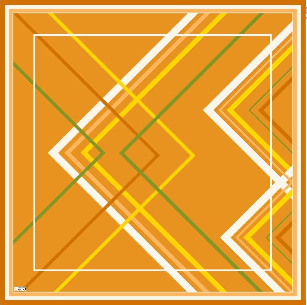 Turuncu zemin üzerinde yeşil, sarı, beyaz renkler ile geometrik desenler oluşturulmuştur.