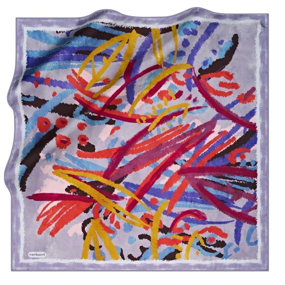 Pudra zemin üzerinde mor, pembe, yeşil, kırmızı renkler ile cacharel yazısı ve fırça desenler oluşturulmuştur.