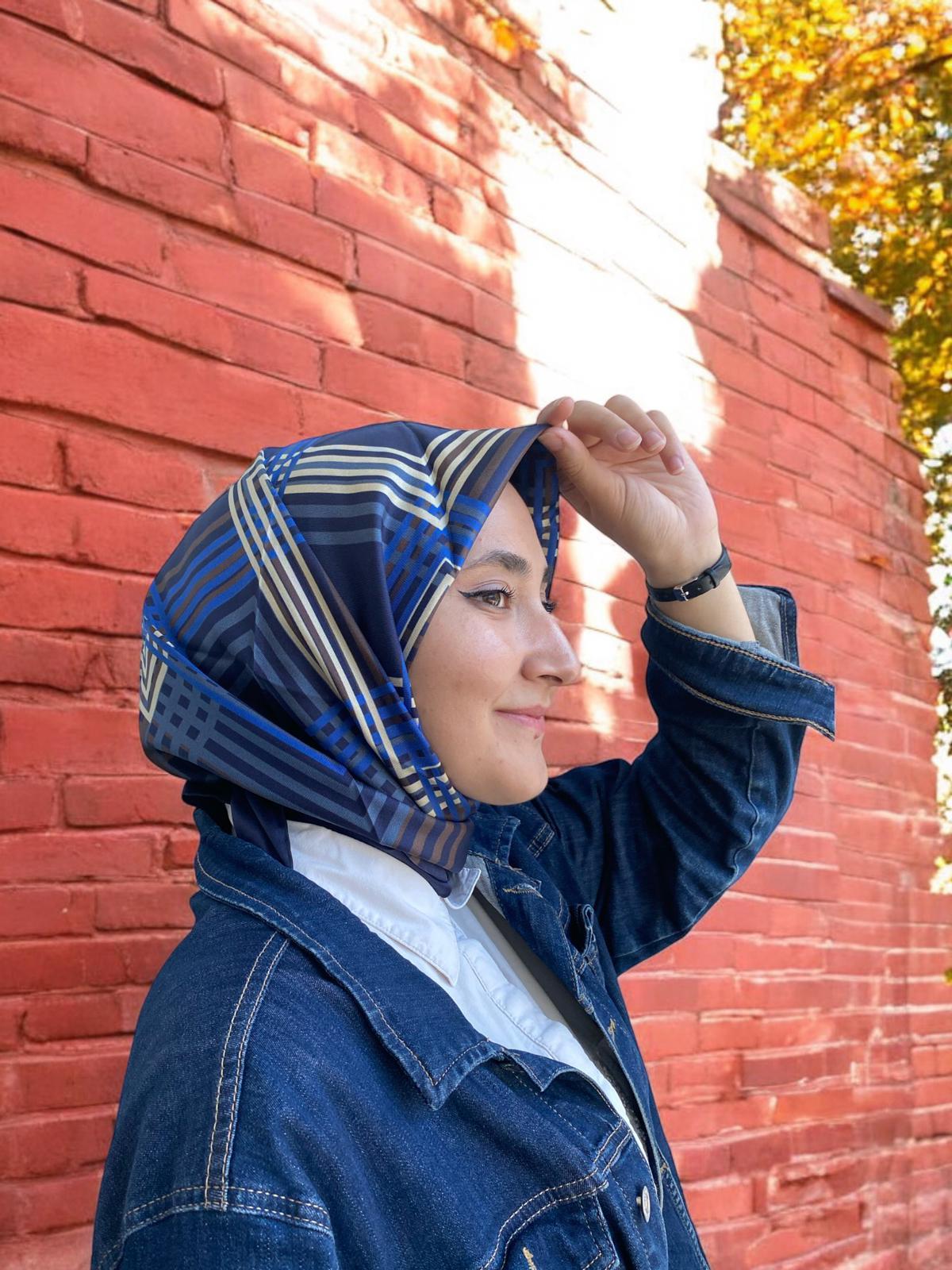 L’awilia Lacivert Mavi Çizgili Geometrik Desen Tivil İpek Eşarp 29011-27