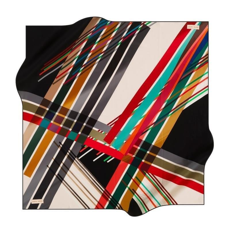 Siyah zemin üzerine kırmızı, beyaz, koyu şarabi, koyu yeşil renk ile çizgili geometrik desen oluşturulmuştur.
